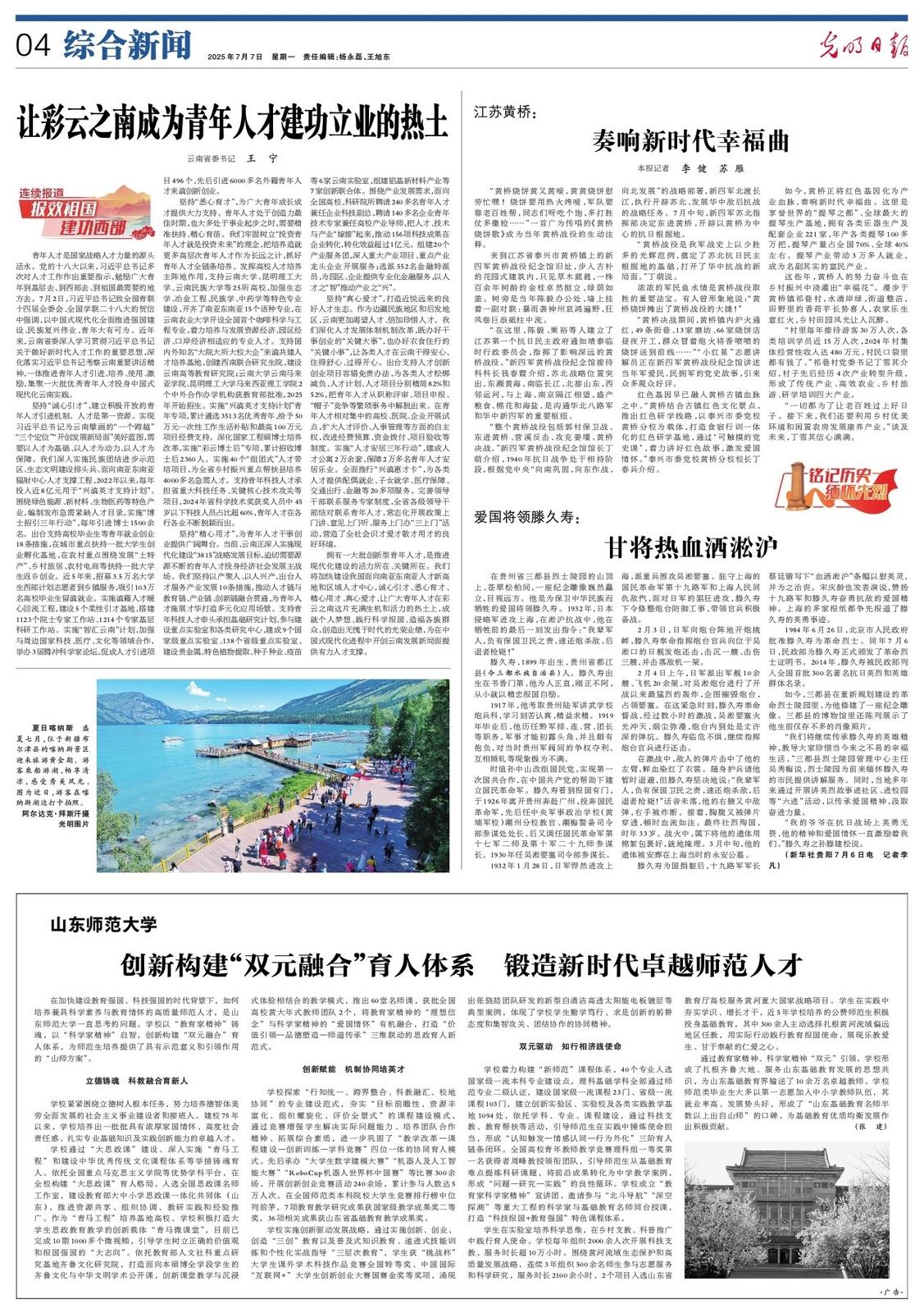 坚持“悉心育才”,为广大青年成长成才提供大力支持。青年人才处于创造力最佳时期,也大多处于事业起步之时,需要精准扶持、精心育苗。我们牢固树立“投资青年人才就是投资未来”的理念,把培养造就更多高层次青年人才作为长远之计,抓好青年人才全链条培养。发挥高校人才培养主阵地作用,支持云南大学、昆明理工大学、云南民族大学等25所高校,加强生态学、冶金工程、民族学、中药学等特色专业建设,开齐了南亚东南亚15个语种专业,在云南农业大学开设全国首个咖啡科学与工程专业,着力培养与发展资源经济、园区经济、口岸经济相适应的专业人才。支持国内外知名“大院大所大校大企”来滇共建人才培养基地,创建西南联合研究生院,建设云南高等教育研究院;云南大学云南马来亚学院、昆明理工大学马来西亚理工学院2个中外合作办学机构获教育部批准,2025年开始招生。实施“兴滇英才支持计划”青年专项,累计遴选3513名优秀青年,给予50万元一次性工作生活补贴和最高100万元项目经费支持。深化国家工程硕博士培养改革,实施“彩云博士后”专项,累计招收博士后2360人。实施40个“组团式”人才带培项目,为全省乡村振兴重点帮扶县培养4000多名急需人才。支持青年科技人才承担省重大科技任务、关键核心技术攻关等项目,2024年省科学技术奖获奖人员中45岁以下科技人员占比超60%,青年人才在各行各业不断脱颖而出。