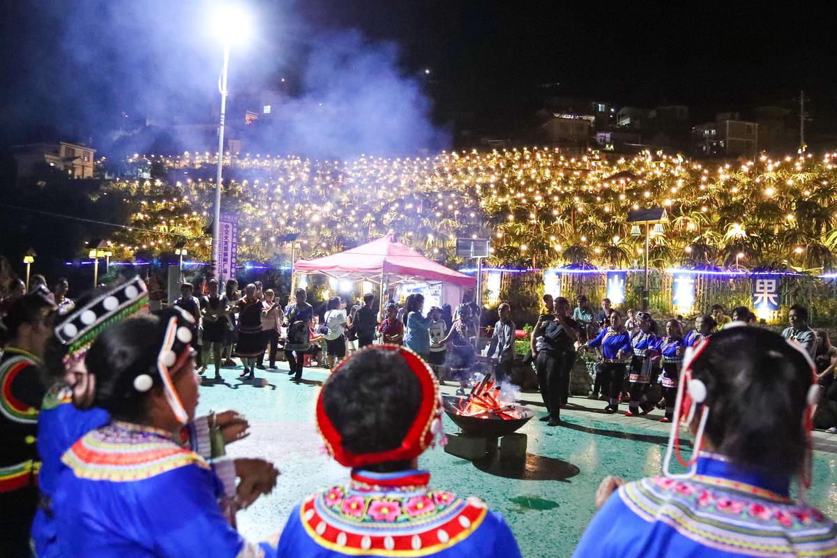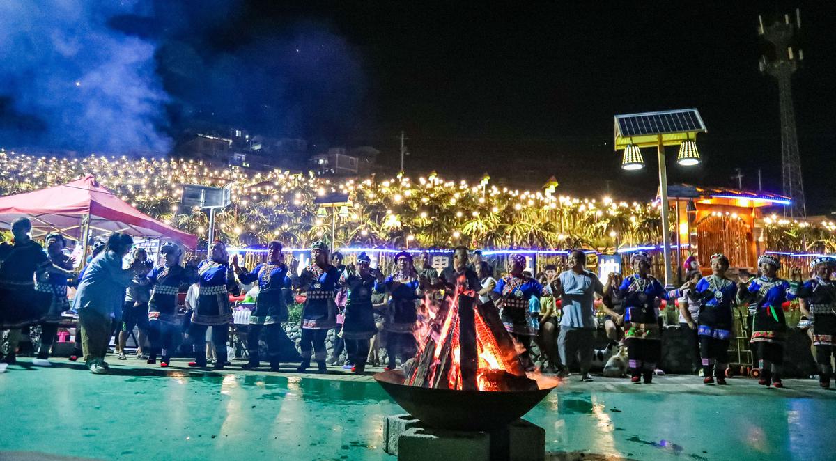 本地村民和游客围着火焰跳起民族舞蹈