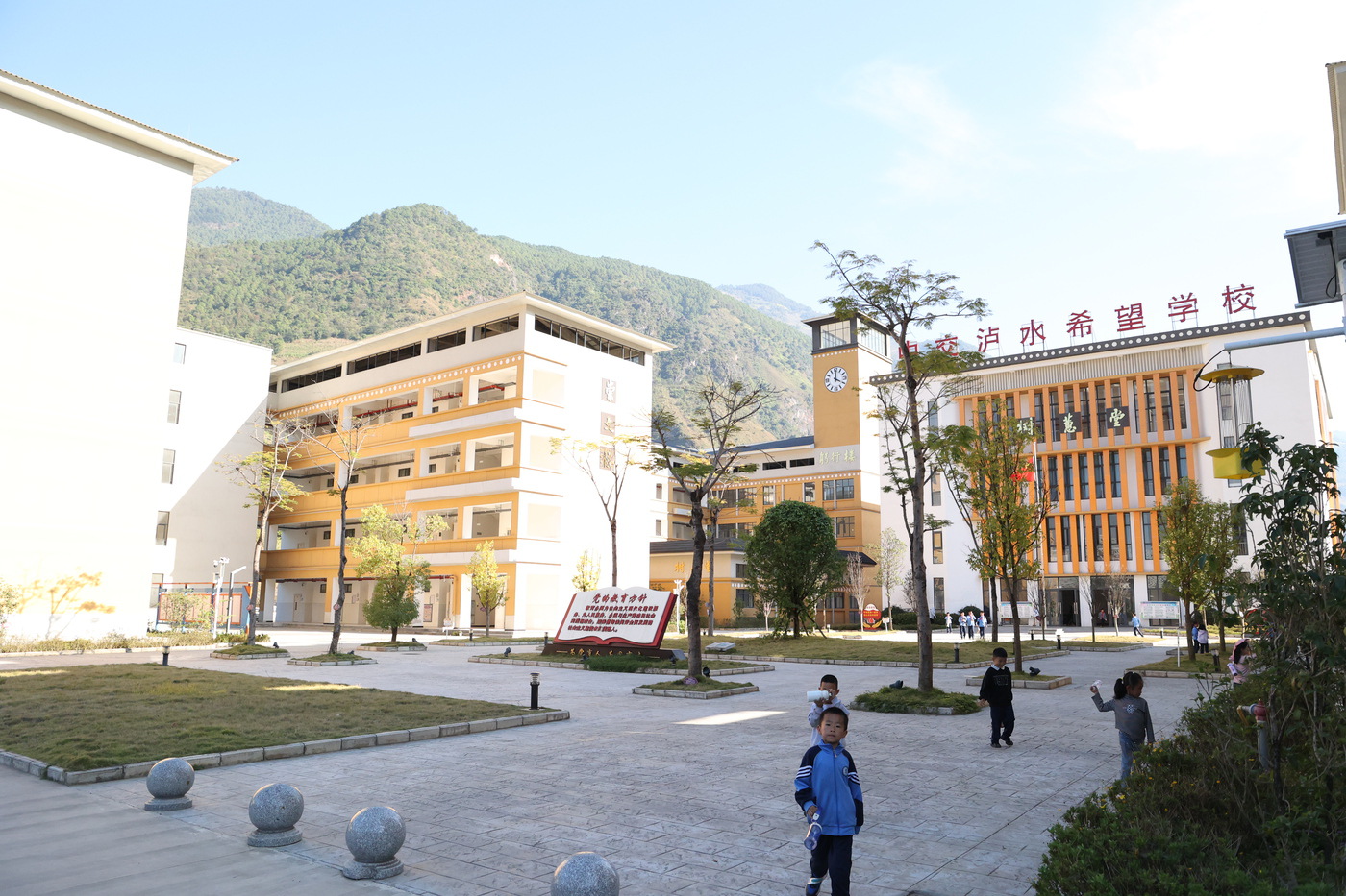 清晨,怒江碧水潺潺,两岸青山叠翠,朝阳将熠熠光辉洒向中交泸水希望学校。橙白相间的教学楼静静矗立在泸水市新城区,在怒江的流转与青山的环抱之中,焕发出盎然生机。