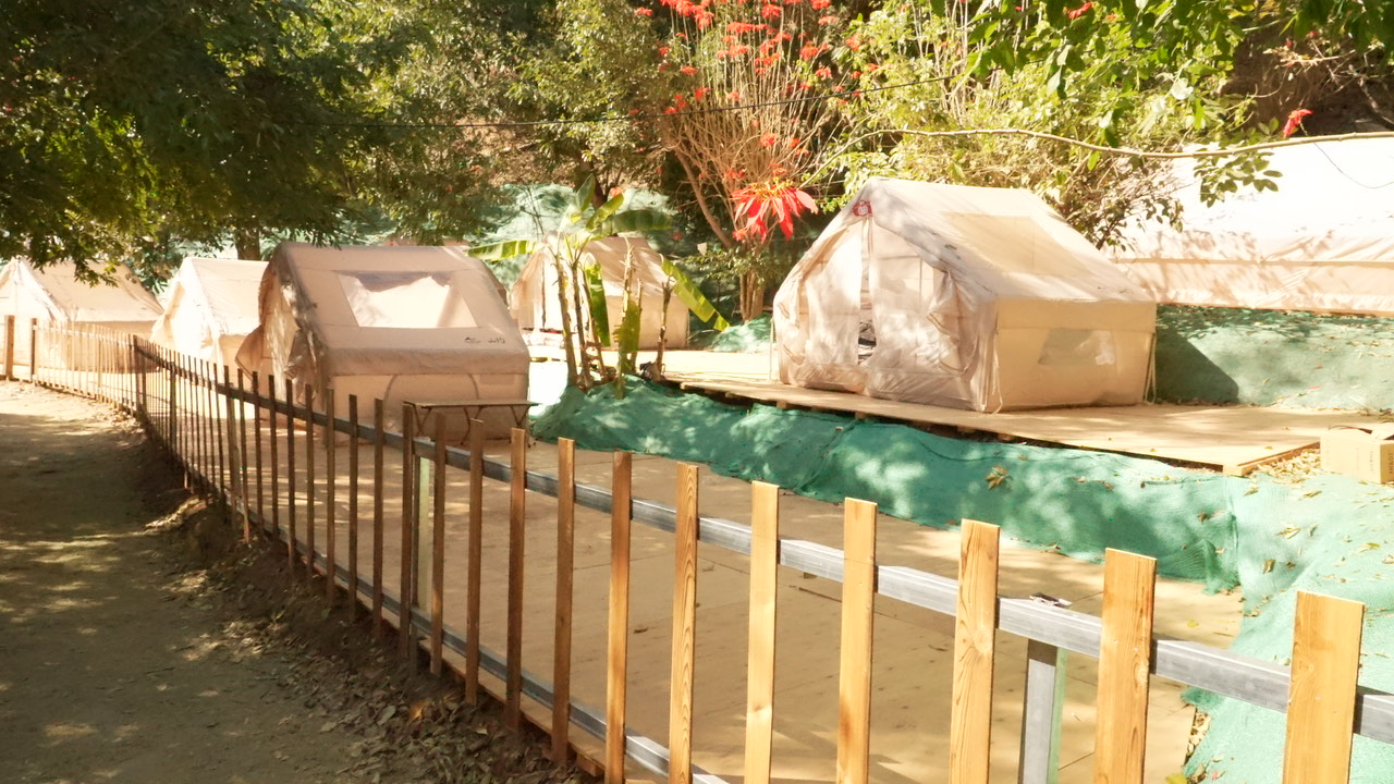 在现场,记者看到错落有致的一顶顶帐篷搭建在防潮的三合木板上,帐篷内空间宽敞,足以满足一家人基本的生活起居需要。