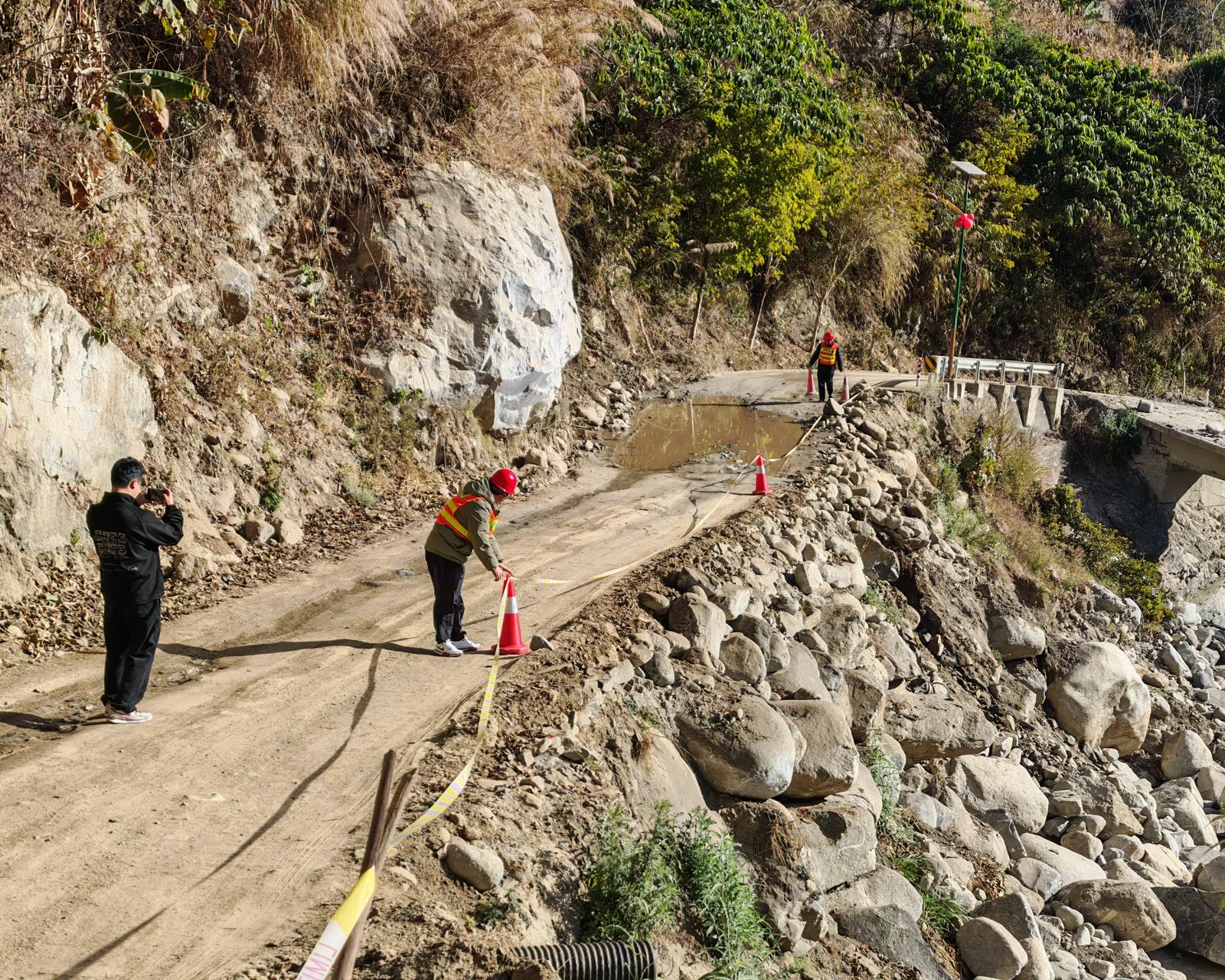 对2025年6月因强降雨灾毁最严重的滴水河公路40余处安全隐患进行再排查,进一步完善警示标识,安放了警示锥桶,拉起了警戒线;