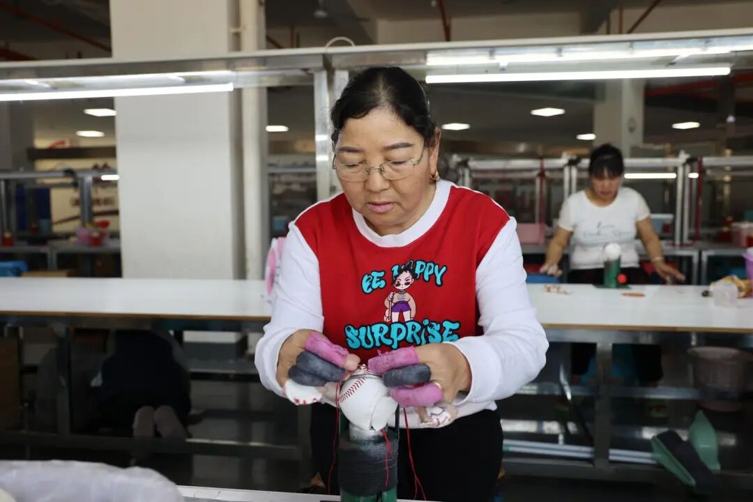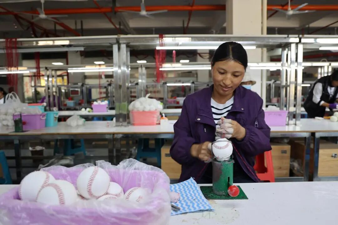 走进棒球车间,一派热火朝天的生产景象映入眼帘。工人们端坐在工位前,穿针、引线、拉紧、整形,动作一气呵成。车间内,刚缝制完成的棒球整齐摆放,成品区打包有序,处处洋溢着复工复产的蓬勃朝气。车间管理员肖六花穿梭于各个工位之间,细致检查产品质量、指导生产操作、统筹成品收集打包,全力保障车间高效运转。